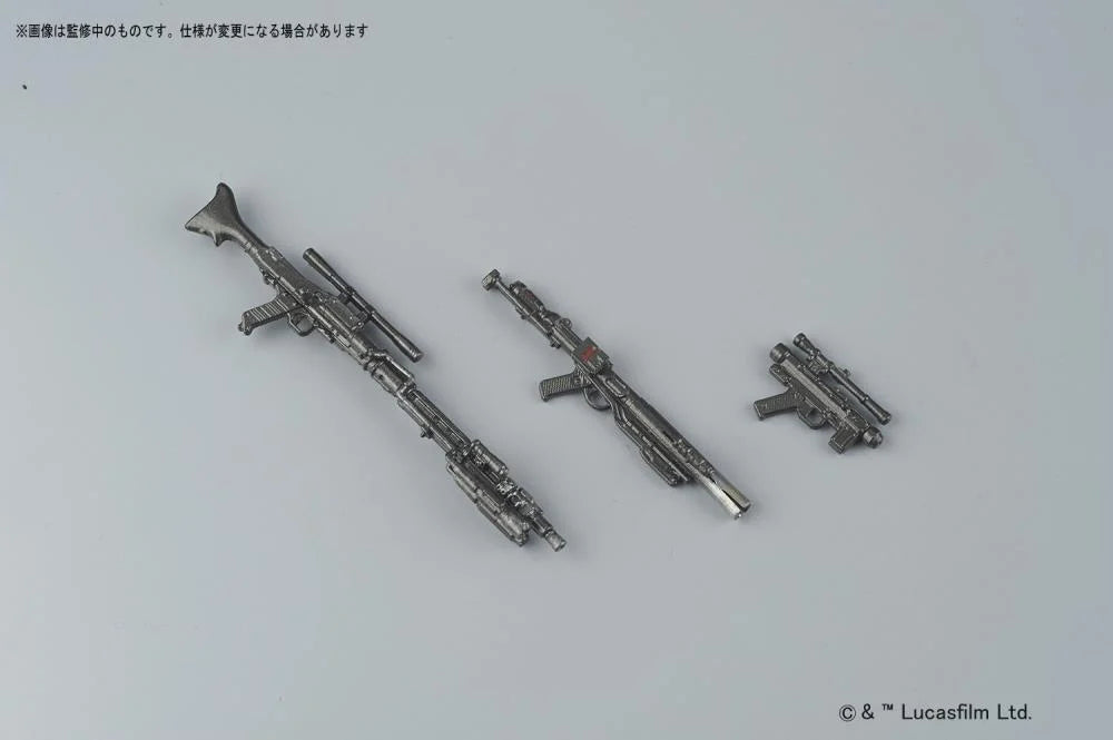 This 1/12 model kit includes a blaster pistol, E-11D blaster rifle, DLT-19F heavy blaster rifle, 2 chest pieces for either a normal Death Trooper or Specialist, 6 interchangeable hands, and a base to display when completed.